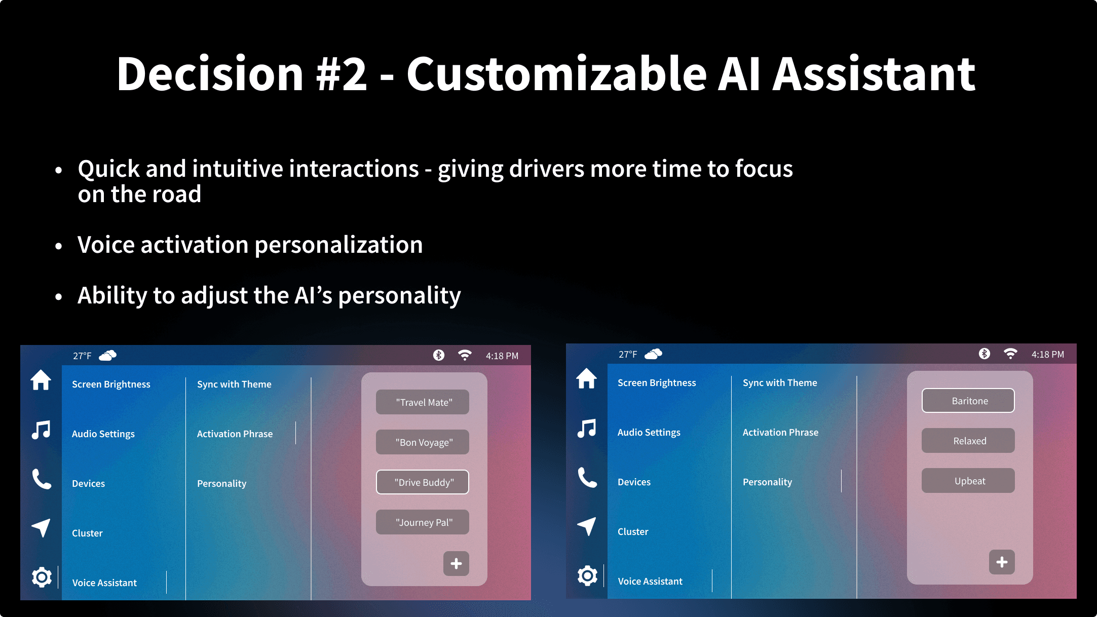 We integrated advanced AI-driven voice assistant features to support users in navigating complex controls, responding to natural language commands, and making proactive suggestions based on context. This decision reflects the research indicating that luxury car buyers highly value advanced technology and seamless interaction with vehicle controls (Automotive World, 2023; J.D. Power, 2023).