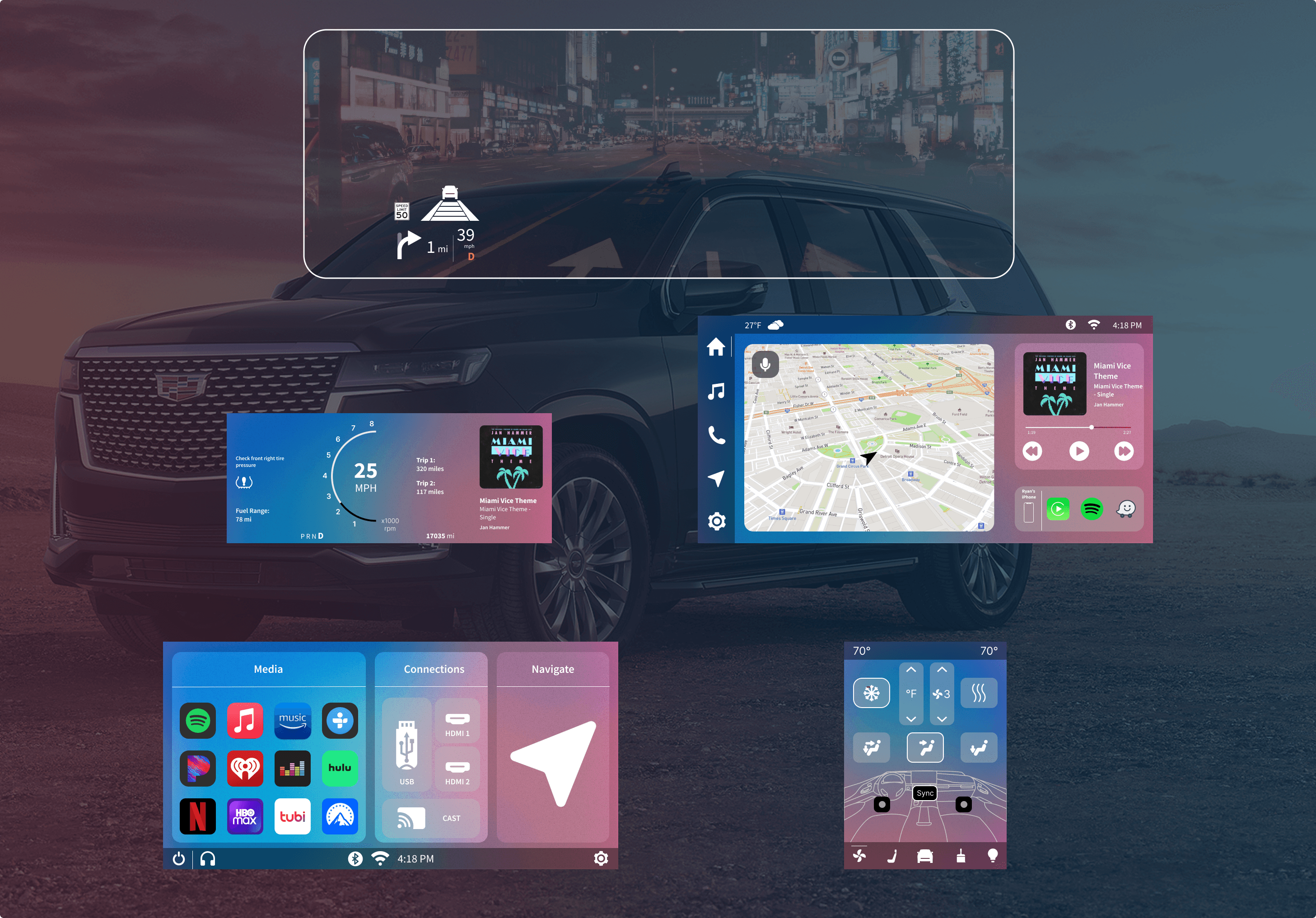 Our HUD design focuses on the ergonomic placement of controls and the use of large, easy-to-target touchpoints, ensuring essential adjustments can be made swiftly, keeping the driver’s attention on the road. This decision addresses safety concerns, emphasizing intuitive and minimally intrusive interfaces to reduce driver distraction (Consumer Reports, 2023; NHTSA study).