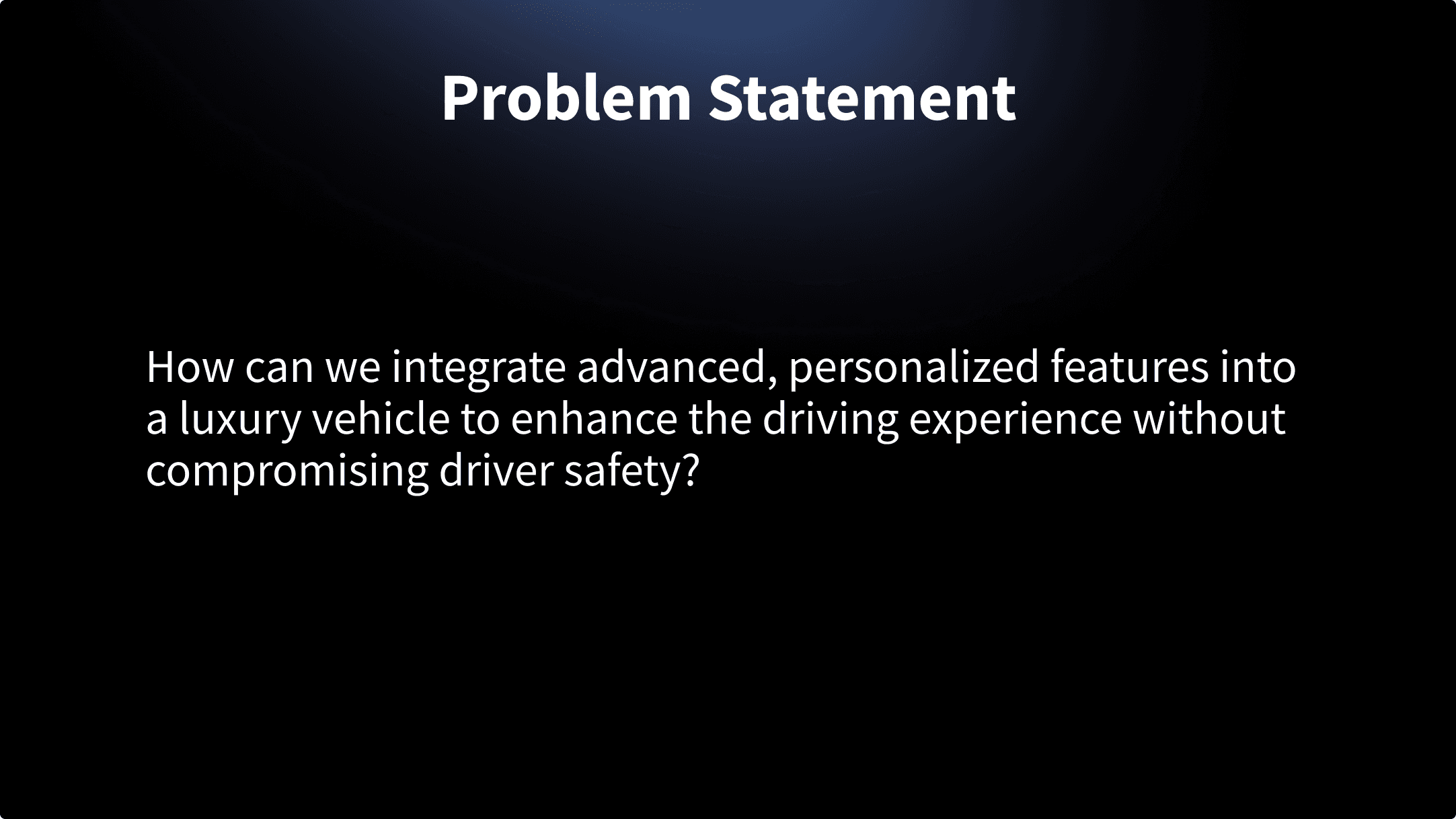 General Motors tasked us with developing a new cross-channel experience, integrating in-vehicle systems with a mobile app, for one of three predefined customer segments: mass market, performance, and luxury. We chose to focus on the luxury segment. Our goal was to design features that appeal to luxury users, including a required in-vehicle theme feature. Therefore, we formulated the following problem statement: How can we integrate advanced, personalized features into a luxury vehicle to enhance the driving experience without compromising driver safety?