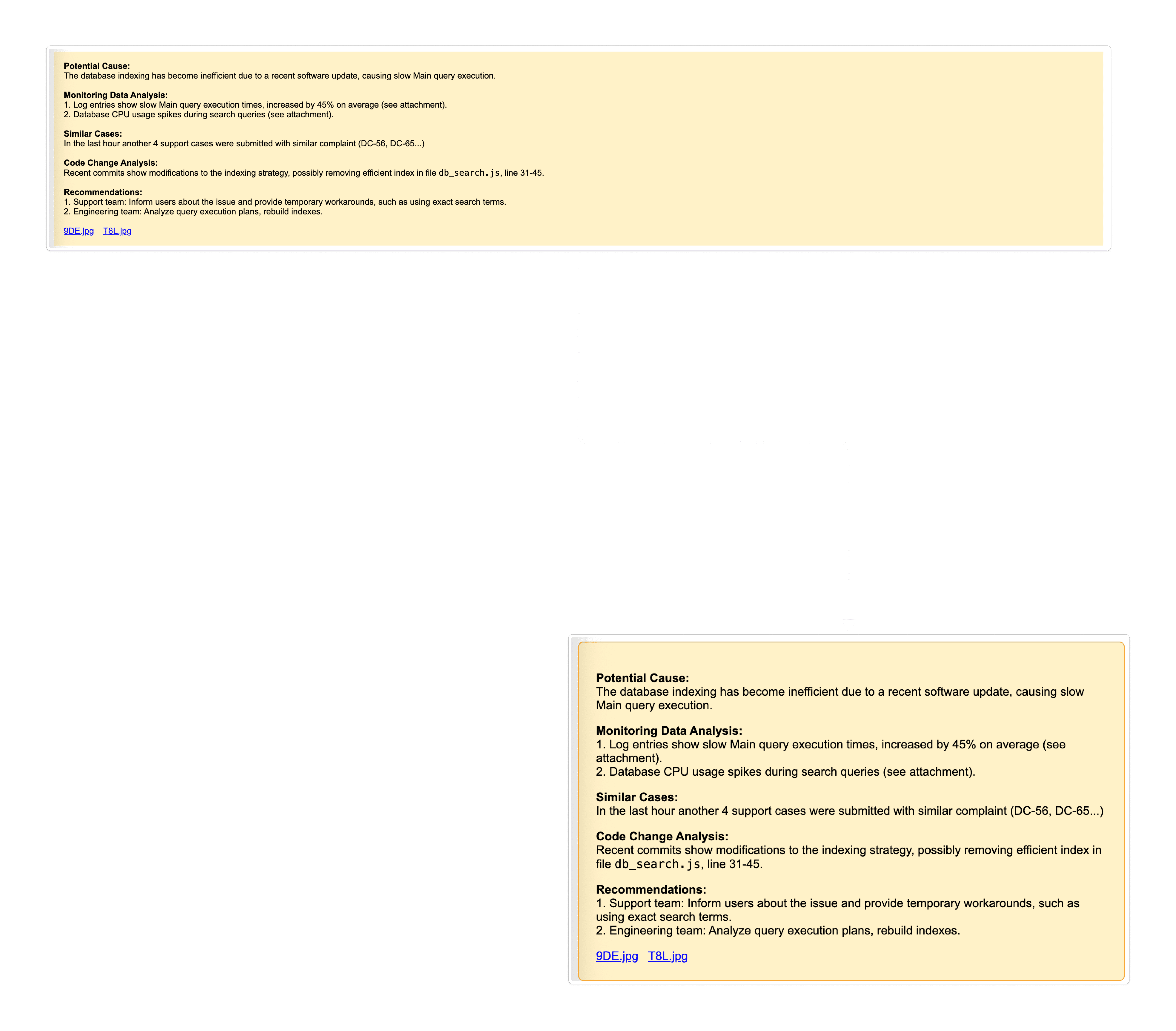 When Strudel was first introduced into Freshdesk, Jira, and Slack, each integration looked inconsistent. For example, in Freshdesk (see “Before” images), insights were delivered as plain yellow text blocks with no visual hierarchy or structure. While functional, this forced agents to parse raw paragraphs of analysis, slowing comprehension and reducing trust in the system.